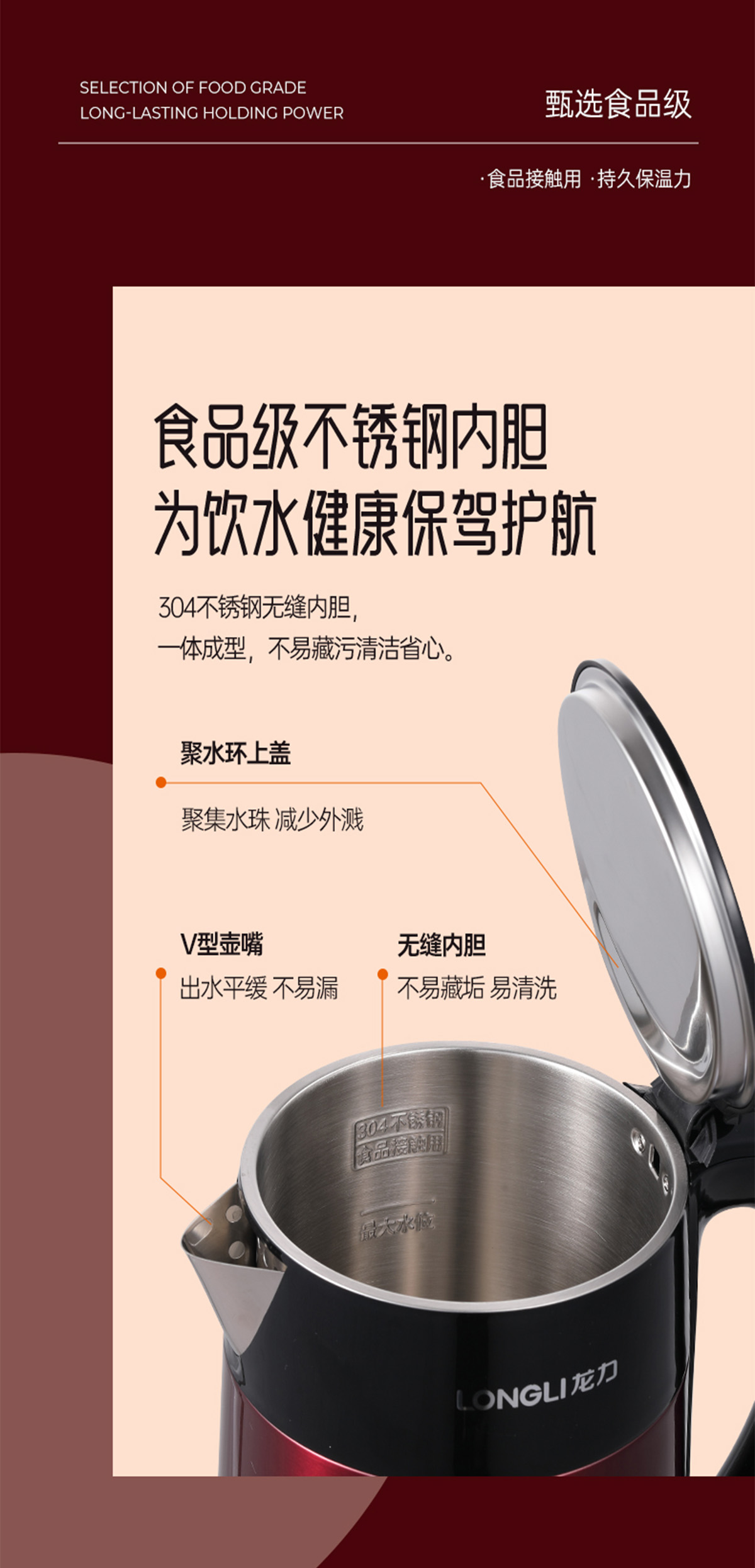 養生的朋友不僅在(zài)食補上講究,更注重(chóng)煮食容器的質量安全。除了外觀顏值,在(zài)材質、工藝上也(yě)同樣講究。內外雙層不鏽鋼材質,外殼雙層隔熱,觸感生溫卻不燙手,內裏是SUS304不鏽(xiù)鋼內膽,煮水安全又健康,喝水不會喝出尷尬鐵鏽味。清潔起來也很容易(yì),大口徑廣角設計,手可以(yǐ)伸入刷洗,再加上一體成型無縫內膽,輕(qīng)輕鬆鬆一擦即可!
