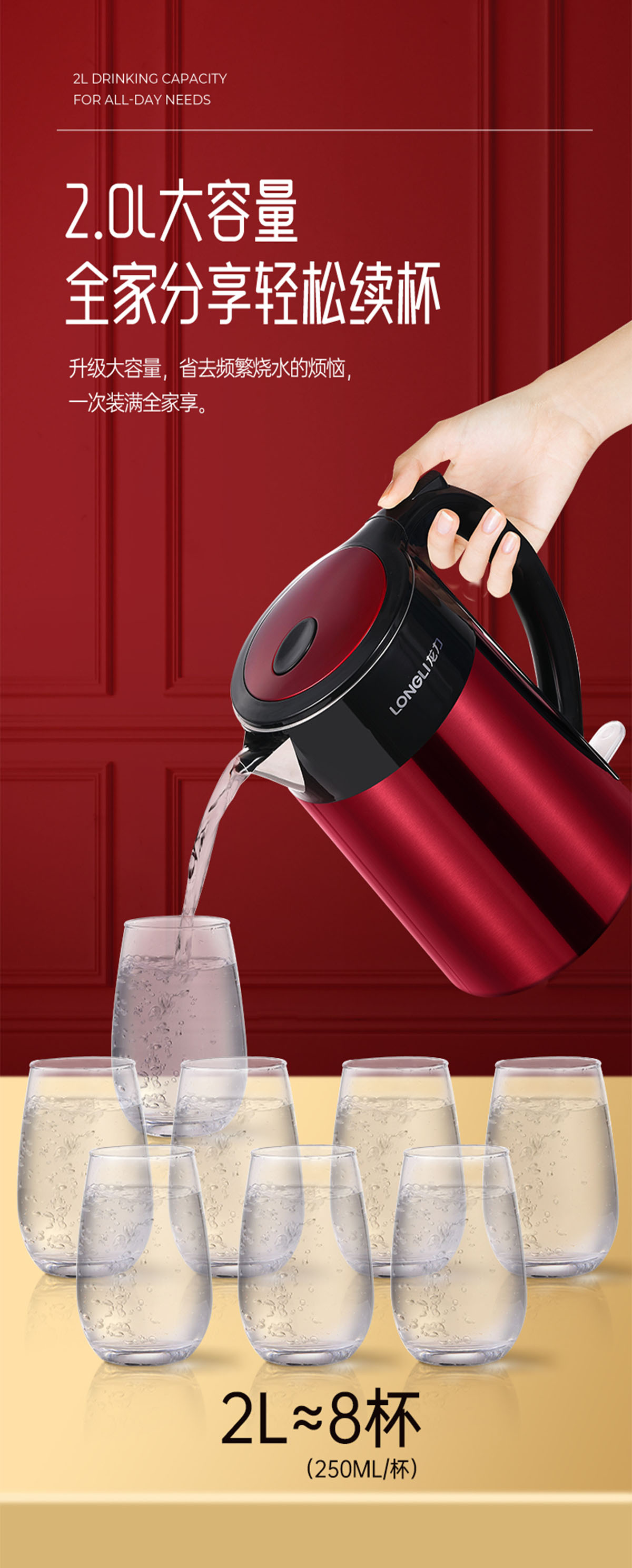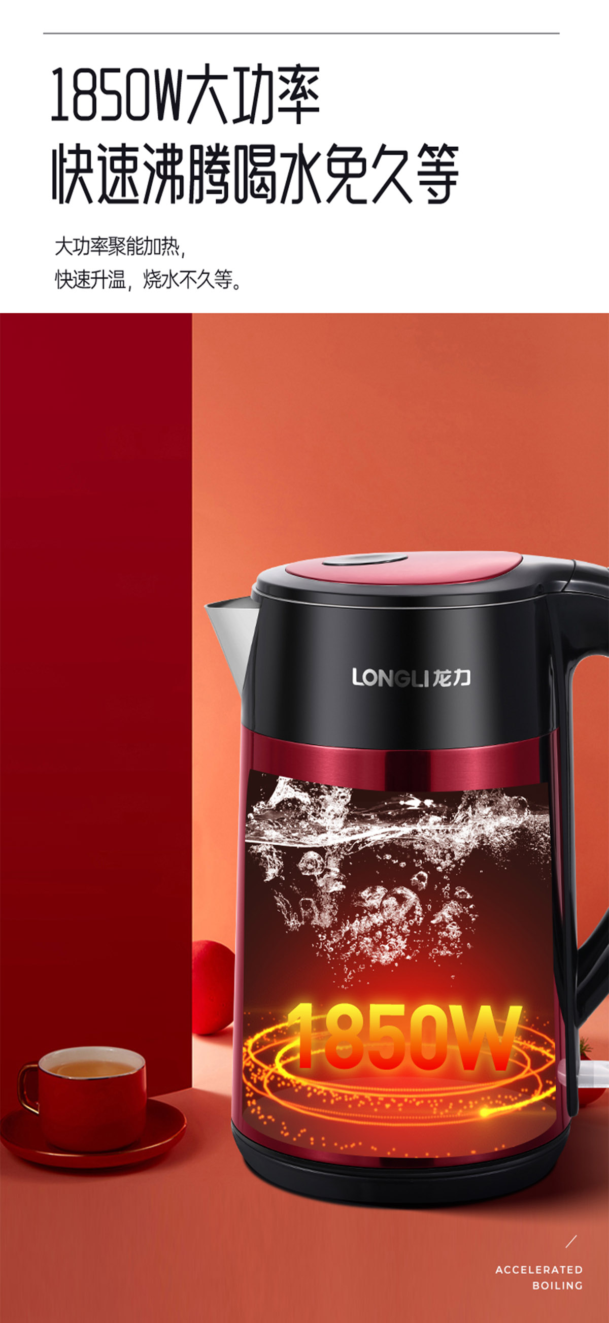 隻要輕輕按下燒(shāo)水(shuǐ)鍵就可以燒水啦,1850W澎湃功率,快速聚能加(jiā)熱,想喝就喝,隨時隨地喝上暖呼呼的熱飲;2L大容(róng)量不論大小家庭都不在話下(xià),一次裝滿全(quán)家共享(xiǎng),無需頻繁加水燒水!